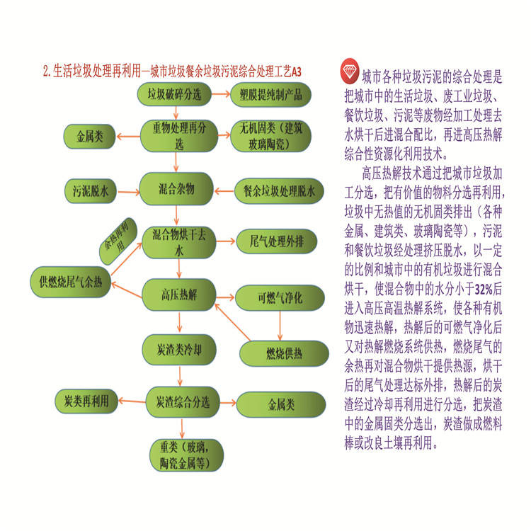 城市里各種垃圾污泥綜合處理是把城市中的生活垃圾、廢工業垃圾、餐飲垃圾、污泥等廢物經加工處理去水烘干后進混合配比,再進高壓熱解綜合性資源化利技術。