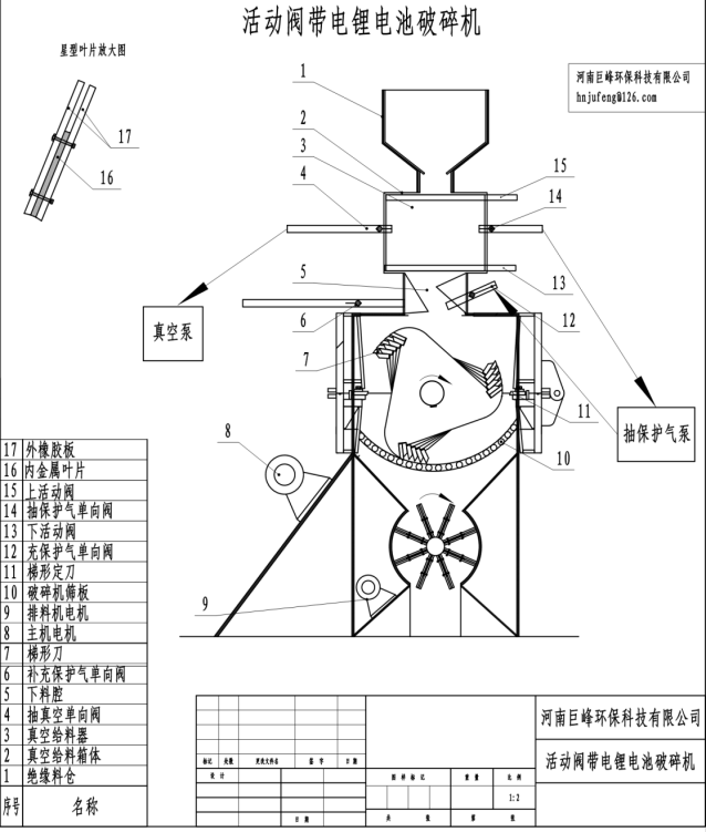 鋰電池經絕緣倉進活動閥真空給料,下閥關上閥開,進料后上閥關,關后抽空,抽后下閥開入破室,下閥關給料器腔抽氣,完成給料工序;物料經Z腔至破室,Z腔防止物料反彈,破室在貧氧狀(破碎室含氧量在小于2%以下可保證帶電破碎的正常安全性),破室進出料閉氧抽空充惰性氣體(常規用氮氣和二氧化碳);惰性氣體作用為提高電解液閃點和揮發點,同時抑制鋰離子從負極到正極幾率,防止放電發熱和爆燃;鋰電破碎時轉子刀與底刀相切破,并起摩擦打散防止金屬殼體包裹正負極片,碎后物料通過真空排料進行外排。