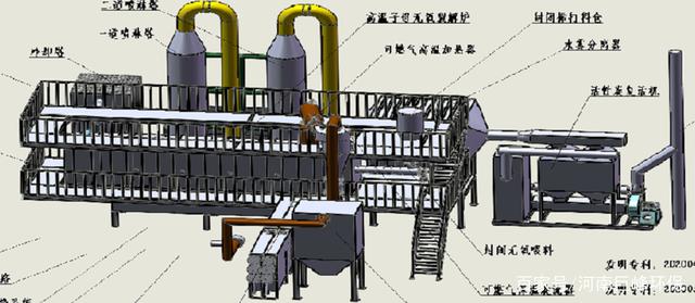 高溫熱解過程中會產生熱解氣及熱解油(氣態),主要成分為短鏈烯烴及酯類有機物,收集熱解得到的熱解氣、油,添加一定比例燃氣輔助燃燒,燃燒溫度1100℃、3S,釋放的熱量可供物料干燥等輔助供熱,尾氣經凈化處理達標排放。