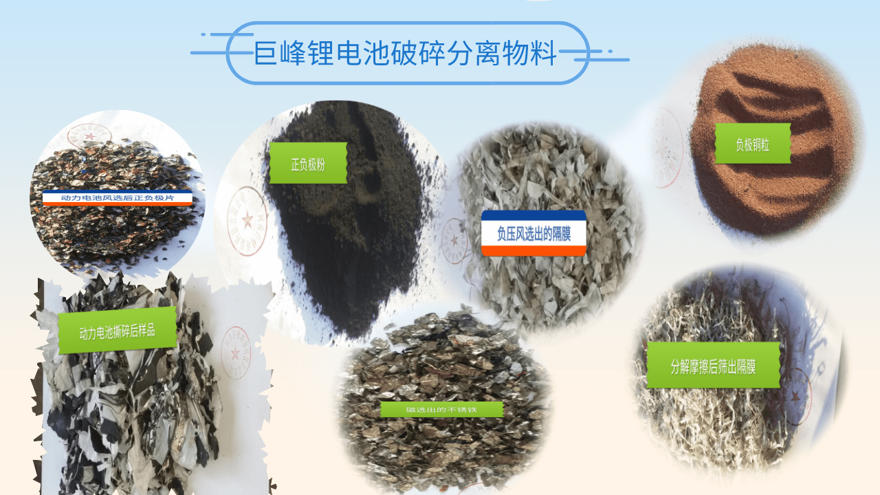 破碎設備將整塊動力電池破碎成片狀隔膜,片狀正負極極片,小塊狀外殼及部分從極片上脫落的粉料,隔膜分選設備是將隔膜與極片、粉料分離收集,攪拌設備是將正負極極片上的粉料與箔材分離,過濾設備及烘干設備是用于除去金屬箔材與粉料中的水分,篩分設備將金屬箔材與粉料分離。